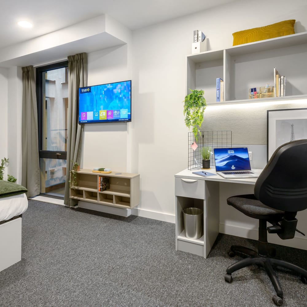 Our shared apartments at true Leicester are perfect for social living, as you'll share a kitchen, dining and lounge area with 9 flatmates. This option still includes the privacy of your own ensuite bedroom with comfy double bed, TV, desk area and luxury bathroom. (Please note that images are for representative purposes only, actual rooms may differ).